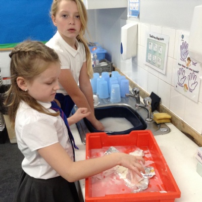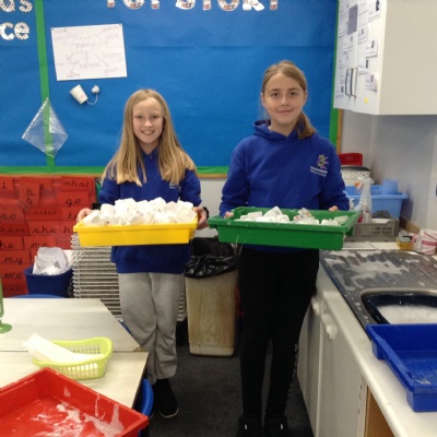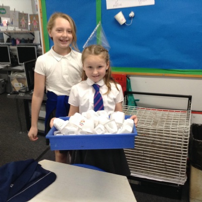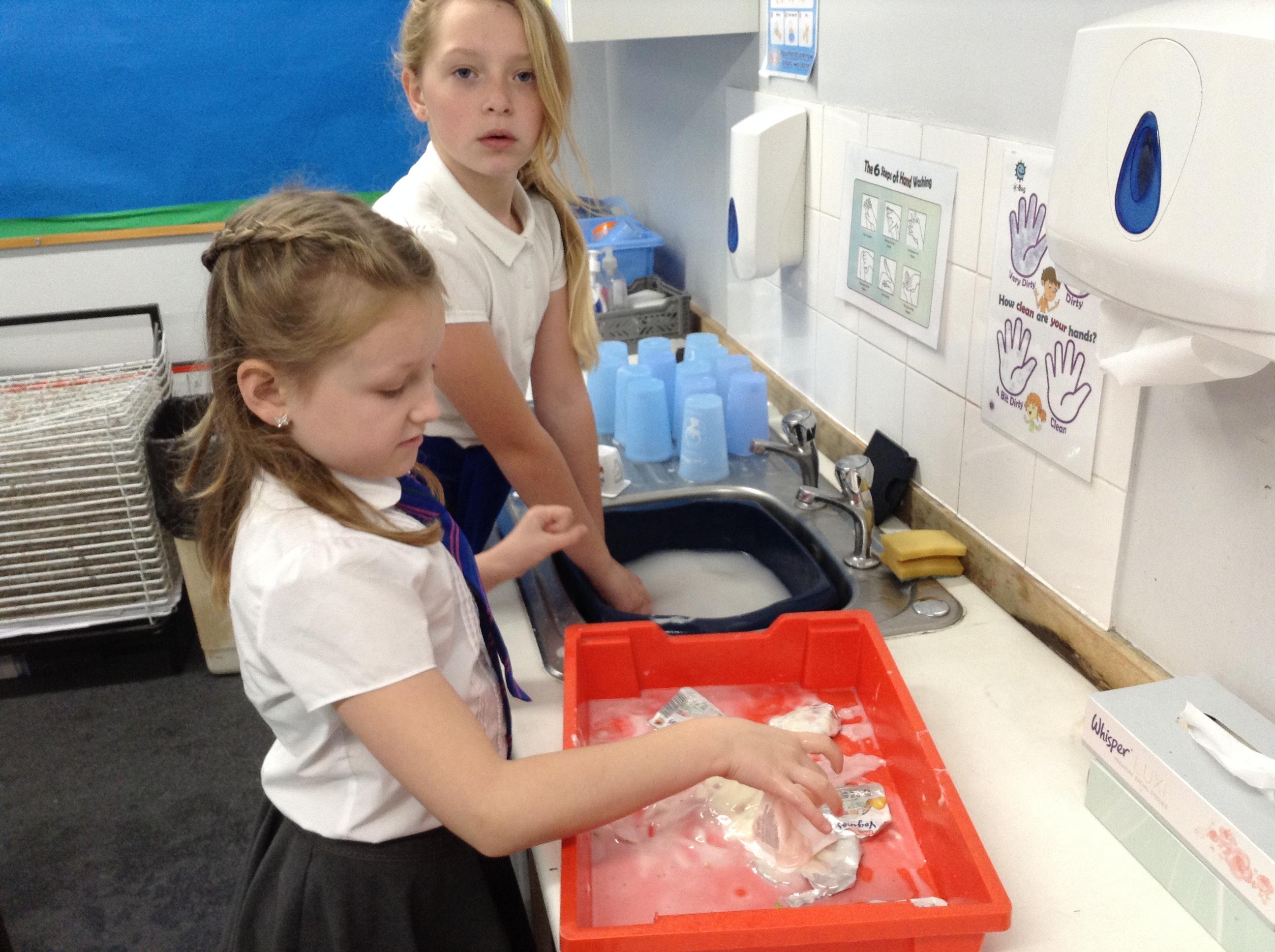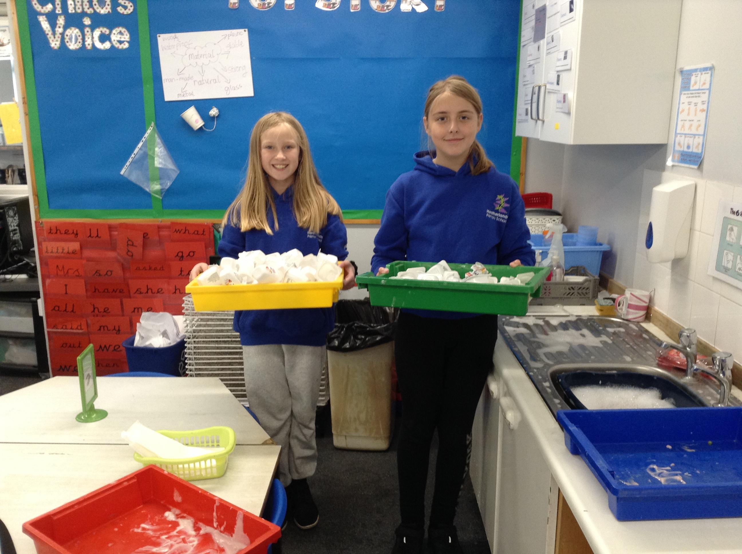 Single use plastics in school. We have now made a mini task force to wash up and recycle yoghurt pots and plastic lids during our lunchtimes. Over 100 plastic post and lids a week are being washed up and recycled by Amelie, Lacey, Sofia and Suri.
