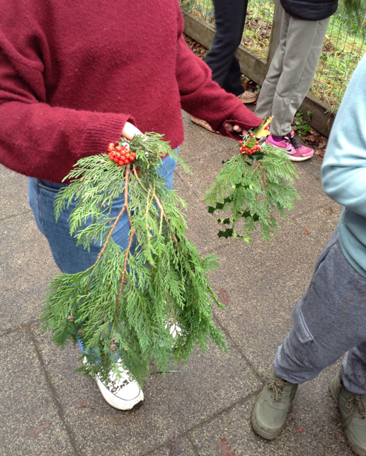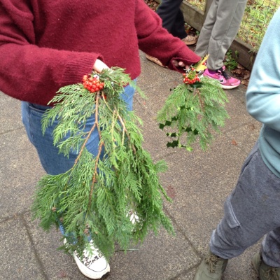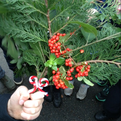 We created our own 'hanging' Christmas decorations from foliage that we foraged from the school grounds. We took cuttings from evergreen trees, such as our conifer and laurel. Hopefully, you can find a nice spot to hang these at home. They smell great too - we even added some seasonal herb cuttings from our flowerbeds!