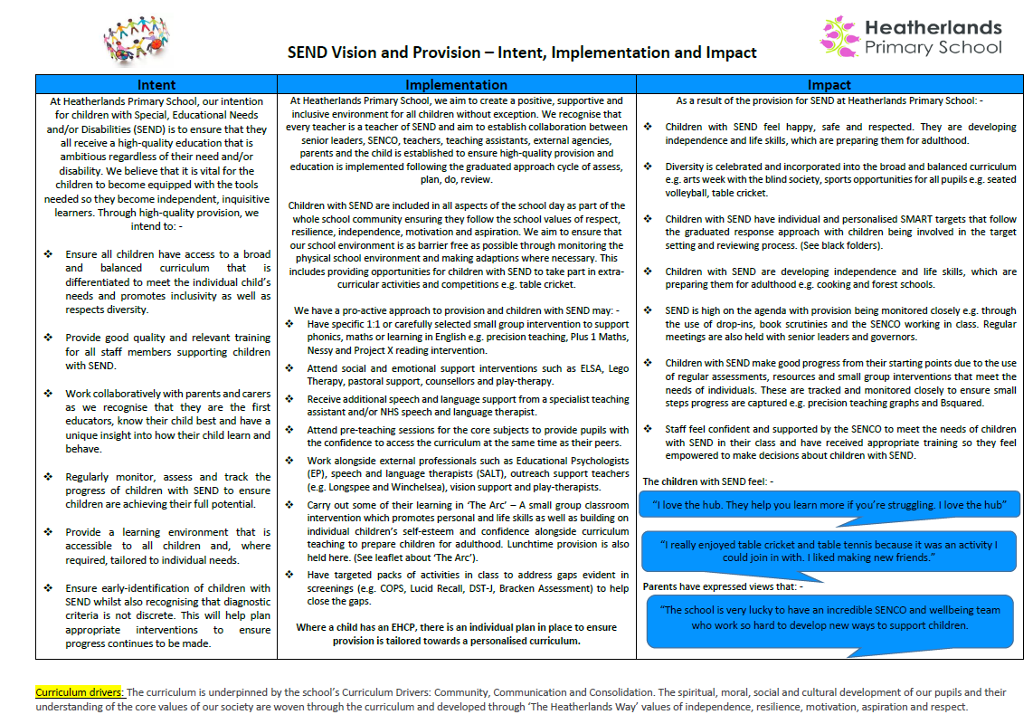 Our Head of Inclusion/Special Educational Needs Co-ordinator (SENCO) is Miss Brown. She can be contacted via the school office. Please click on the links below for further information on SEN.