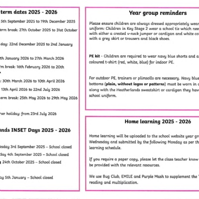 PE days: Monday (outdoor) & Tuesday (indoor). Children to come into school dressed in PE kits.