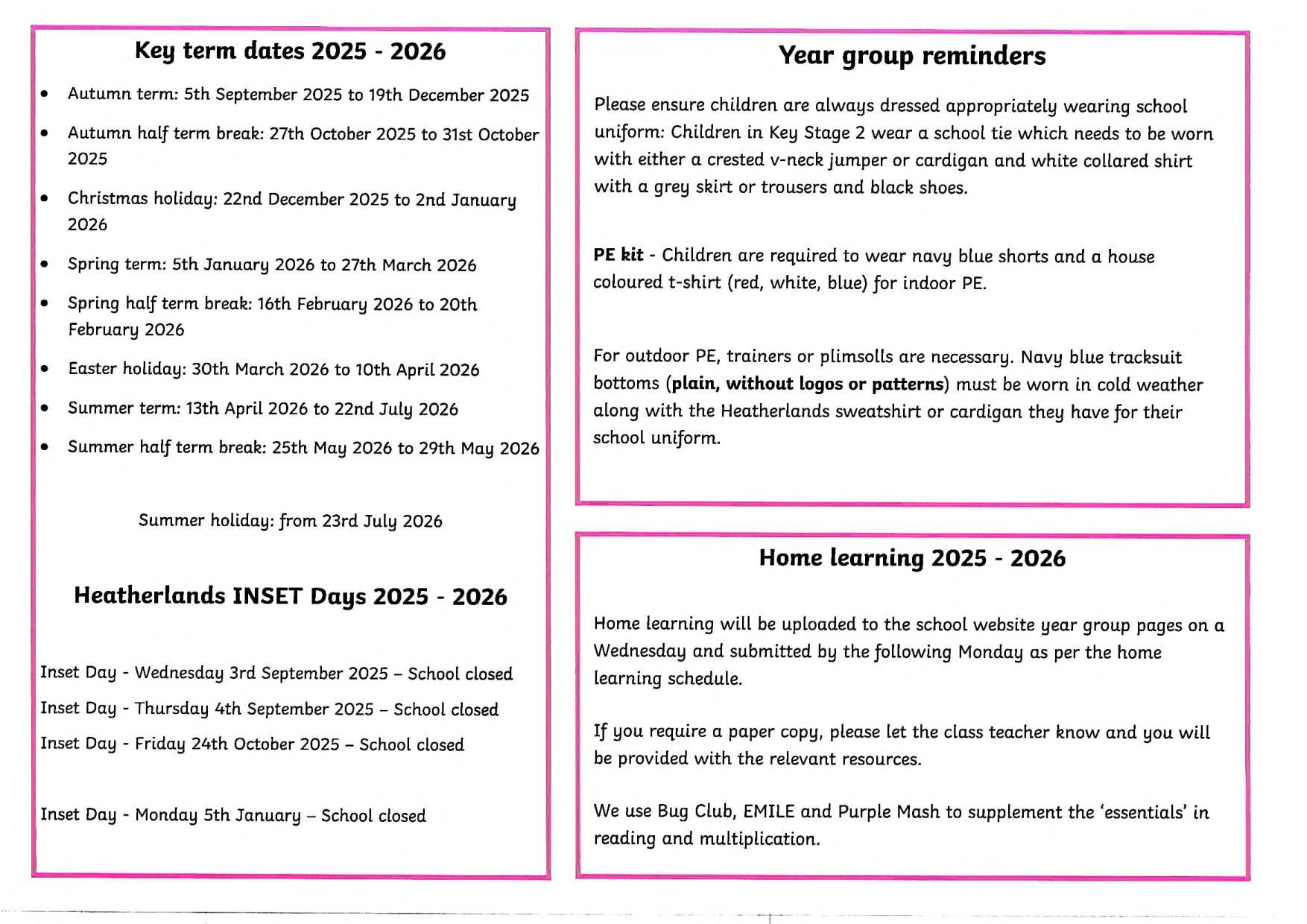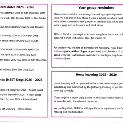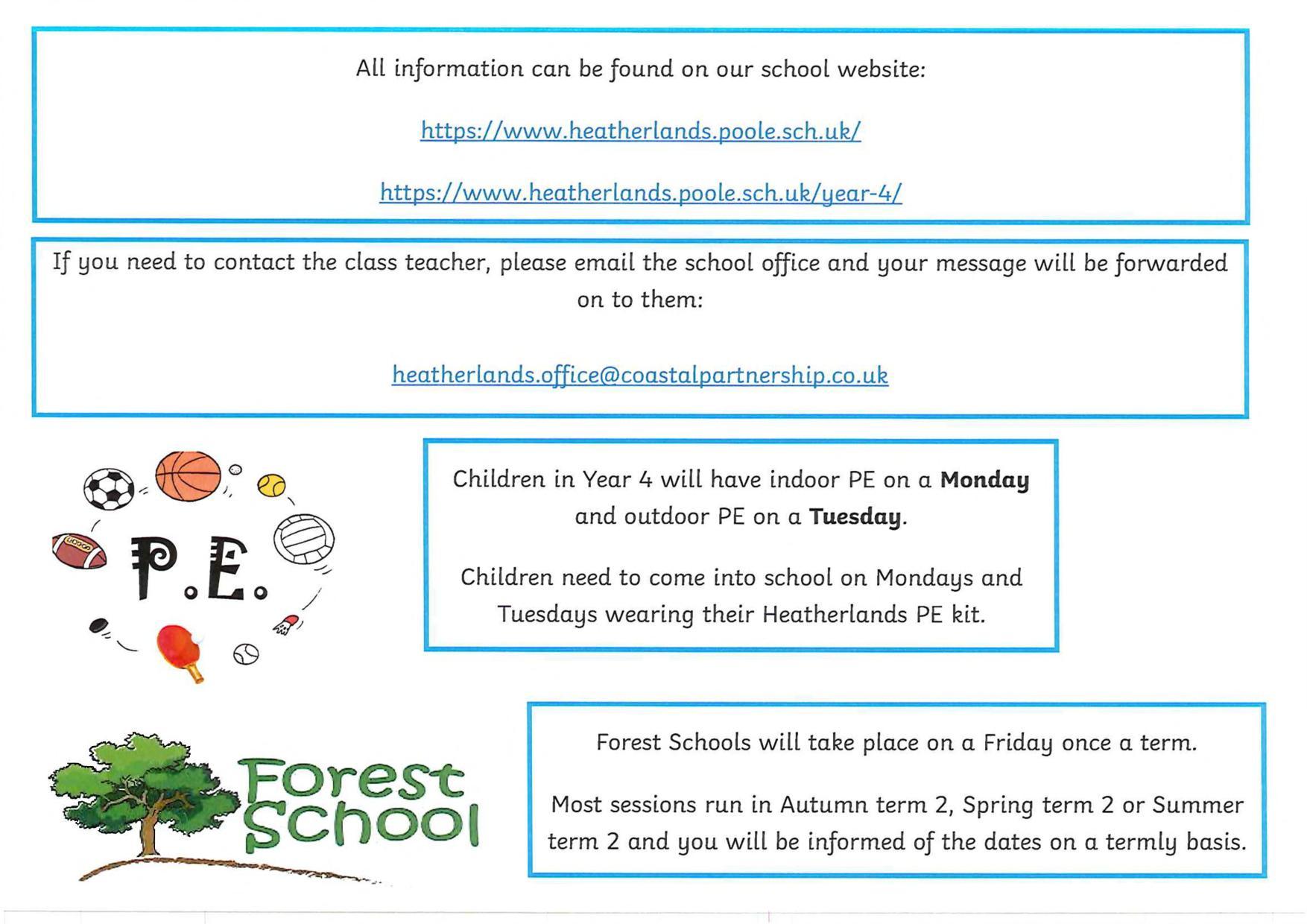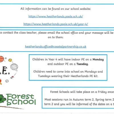 PE days: Monday (indoor) & Tuesday (outdoor) - Children to come into school dressed in PE kits.