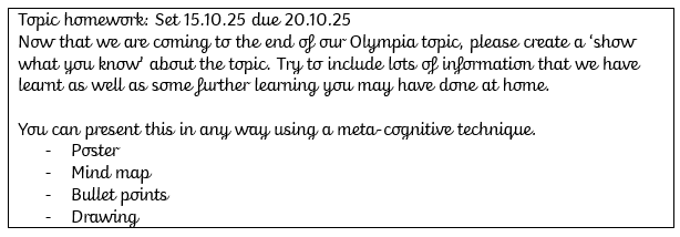 PE days: Tuesday (outdoor) & Friday (indoor) - Children to come into school dressed in PE kits.