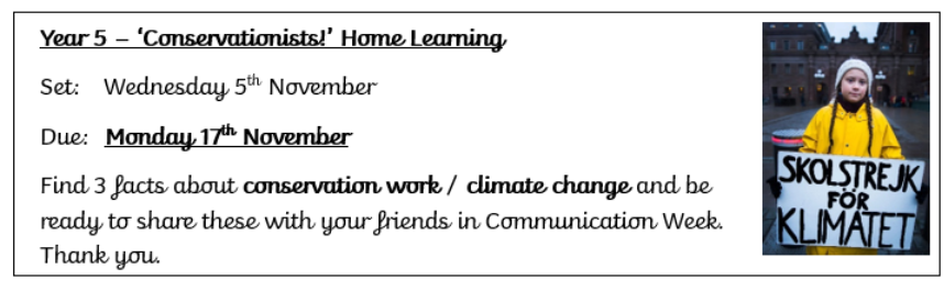 During the week beginning 10th November, we will be creating art with an environmental message e.g. stop destroying the rainforests or do not drop litter. For this, the children will be creating collages. To be in line with our theme, we would like the children to bring in any recycling from home that could support them with this. This includes things like, cereal boxes, egg boxes, empty orange nets/ similar, interesting fonts and lettering that they come across on packaging and any images or colourful things that they could stick on to their collage.