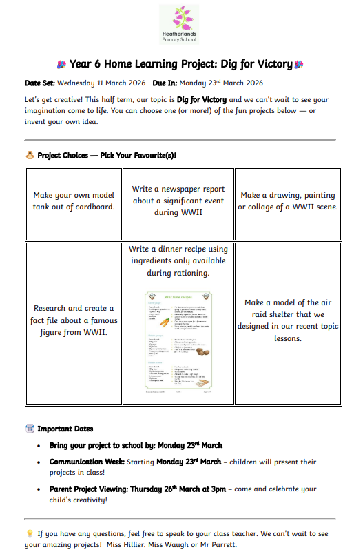 This half term, we've been exploring the exciting topic Fantastic Jurassic! For your homework, we’d like you to get creative and show us what you’ve learned. You can choose how to present your work — it could be a fact-filled poster, a short story set in the Jurassic period, or even a comic strip showing a day in the life of a dinosaur. The most important thing is to be imaginative and include facts and ideas we've covered in class. We can't wait to see your fantastic creations!