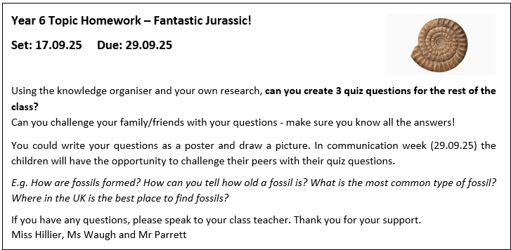 This half term, we've been exploring the exciting topic Fantastic Jurassic! For your homework, we’d like you to get creative and show us what you’ve learned. You can choose how to present your work — it could be a fact-filled poster, a short story set in the Jurassic period, or even a comic strip showing a day in the life of a dinosaur. The most important thing is to be imaginative and include facts and ideas we've covered in class. We can't wait to see your fantastic creations!